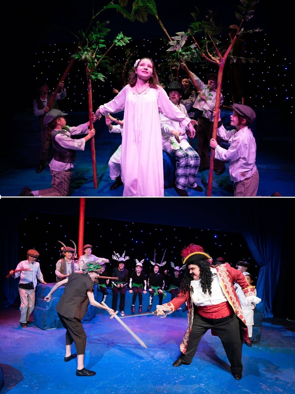 TOP: Emma Lynch as Wendy; ABOVE: Whit Jenkins as Peter Pan and Alan Gutierrez-Urista as Captain Hook in ‘Peter Pan and Wendy.’ Photos by William Gallagher.