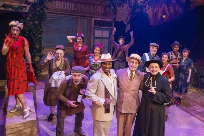 Directed by Gordon Greenberg, the audience is fully immersed in the staging, with some seated at café tables in the village square, a few invited by members of the cast to engage in a pre-show jeu de boules and a waltz, the characters moving through the aisles and around the house, and Denise, the wife of the café’s proprietor doing her chores and singing her “Chanson” in French and English, noticing our presence and directly addressing us with a welcome to the small town in Provence, where “nothing much changes” – until tonight, with the arrival of the new baker Aimable, after going weeks without bread since the death of the old one.