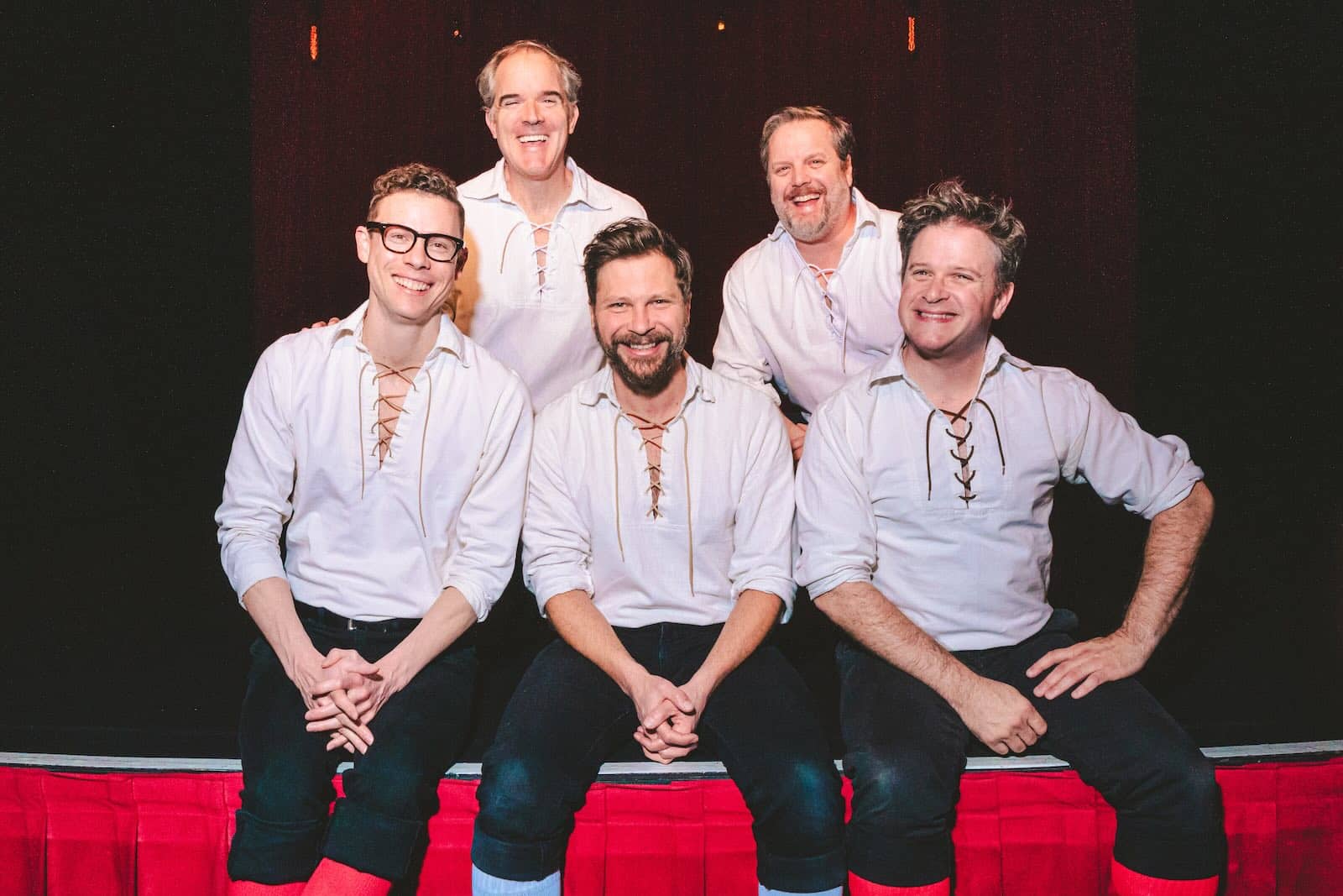 With seemingly encyclopedic memories for random facts, mischievous propensities for farcical indecency, and a deep rolodex of Shakespearean knowledge, the level of skill, study, and iambic preparation brought by the company to every performance is staggering. It’s one thing to be a brilliant improv actor; it’s quite another to do said brilliant improv-ing within the verse-like stylings and thematic tendencies of the Bard. And yet, scene by scene and trope by trope, Joey Bland, Ross Bryant, Brendan Dowling, Randall Harr, and Blaine Swen tick off the Shakespearean checklist with jaw-dropping agility and flair. Lyrical prologue? Easy. Star-crossed lovers? Check. A (clumsy) trap to expose a villain? Of course. The more the plot tangled, the greater the delight — especially in watching each of the five raise the bar on one another, egging each other on from the wings, and lay plot-point trip hazards for someone else to make sense of (just ask anyone in attendance on December 2 about the six, yes six, stages of Milanese romance: JCPDLP).