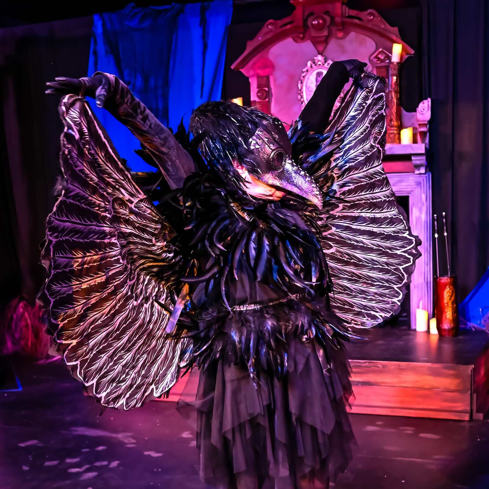 And their costumes! The costumes (also by Sarah Belle Joyce) of the Raven and all the ghosts are magical in their steampunk, maximalist creativity, as is the makeup artistry (Siobhan Beckett). The last bit of brilliance, which transforms the theater with the yowls of a black cat, a raven, and original ethereal compositions, is the sound design/original composition by James D. Watson III.