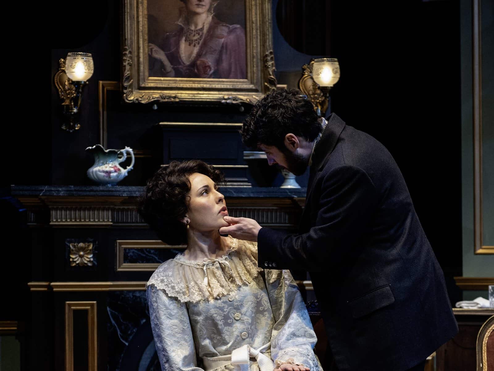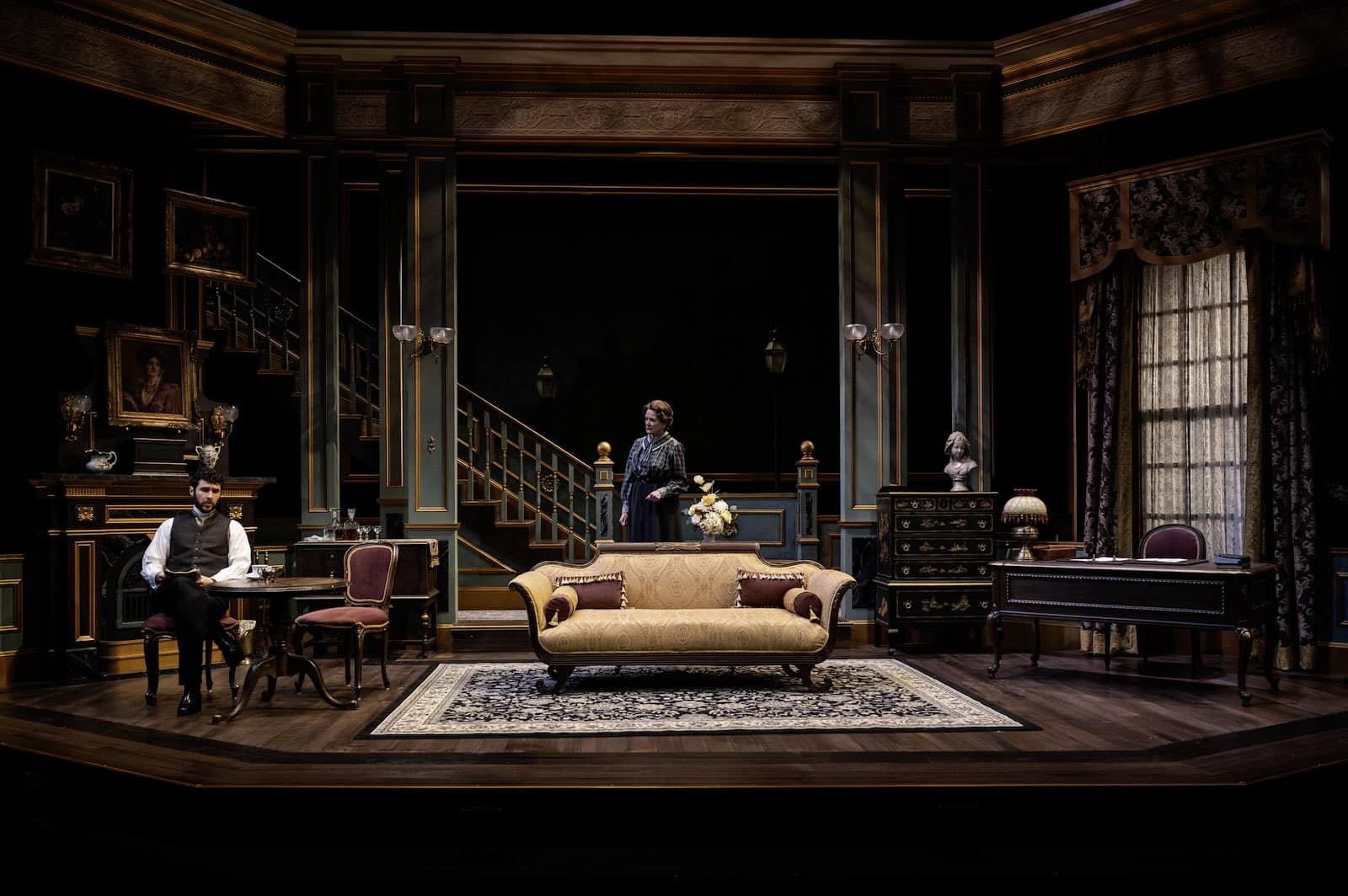 The story unfolds in the sitting room of a middle-class London home in 1901, and scenic designer Daniel Ettinger has created a space that feels stunningly lived-in, layered, and evocative. The room is warm on the surface — rich wood tones, carefully chosen upholstery, soft lighting — but beneath that warmth lies a subtle chill. The shadows cling to corners a little too tightly, and the air feels thick with unspoken tensions. It’s the kind of environment where you sense that every object might hold a memory, every doorway might hide a secret, and every silence stretches just a heartbeat too long. Ettinger’s work doesn’t just set the scene; it builds the emotional architecture of the entire play.