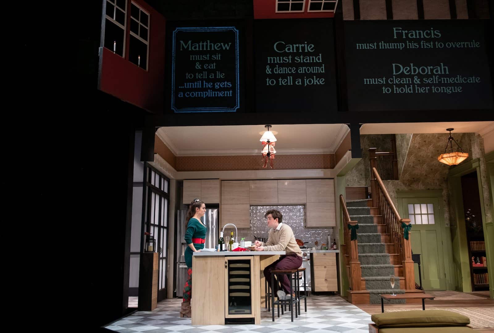 The title Rules for Living refers to a principle from Cognitive Behavioral Therapy, whereby everyone unconsciously creates rules of behavior for themselves to keep uncomfortable emotions at bay, but the rules often solidify into habits that do more harm than good. And here lies the play’s true stroke of comic genius: the particular “rules” the characters employ appear one by one above the proscenium, clueing the audience in to what is actually going on under what the characters say. They include: