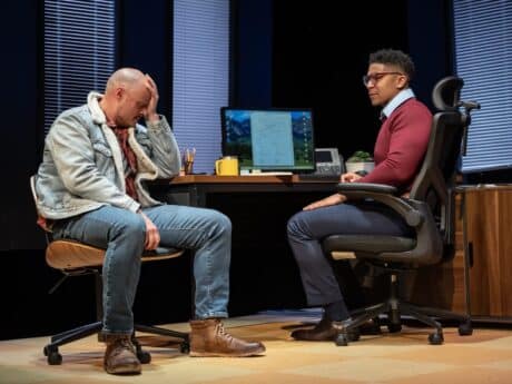 Adult men do not readily form bonds of platonic love and trust with each other, much less across societal divisions of race, economic disparity, and sexual orientation. The rarity of unabashed male-male rapport is cast into sharp relief by Samuel D. Hunter’s heart-wrenching two-hander, A Case for the Existence of God. Hunter’s pitch-perfect script tells the engrossing story of a down-to-earth, uncommon friendship that grows between two men who are of the same age but in nearly every other respect starkly different: One, Ryan (Lee Osorio), is white, a dirt-poor factory worker, straight, and getting divorced by his wife. The other, Keith (Jaysen Wright), is Black, a comfortably middle-class mortgage broker, single, and gay. Their connection begins improbably when they meet at a day-care center where each takes his toddler daughter. They meet again, at what is the start of the play, in Keith’s sleekly neat home office, where Ryan has come in hopes of obtaining a loan to buy land on which to build a home for his daughter. Both actors have moments of sweet humor and extraordinary monologues of emotional self-disclosure, which they embody with such inner truthfulness that we are drawn steadily into their human pain. Slowly and surely, their daughter-centered affinity becomes a reciprocal regard between them that could, in other contexts, surpass the connection of affection. The open-hearted performances of Osorio and Wright reveal a dimension of two men beholding one another wholly that in less secular contexts could pass for beatitude. A Case for the Existence of God depicts a kind of open-heartedness that the world dearly needs.  — John Stoltenberg