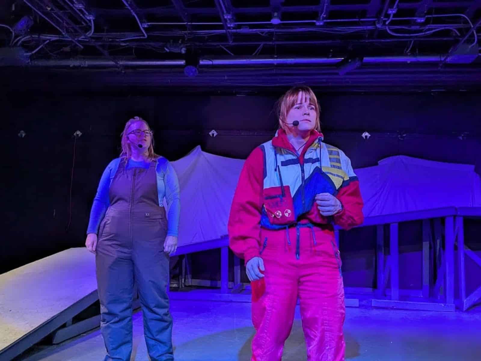 This play tells the story of the Climber — played by Diana Raynes — as she travels back to base camp after summiting one of the world’s highest mountains. Accompanying her via radio calls and the Climber’s imagination are the Manager (played by Mercury Eadie), head of base camp and occasionally the voice of the Climber’s doubts, and the Partner (played by Guen Spilsbury), the Climber’s lover, whom she left partway through the climb to blaze a path ahead. As exhaustion, oxygen deprivation, and the unforgiving mountain conditions set in, the Climber uses songs and the stories of the real-life mountaineers who came before to keep her focused as she navigates the mountain and the impacts of her choice to climb.