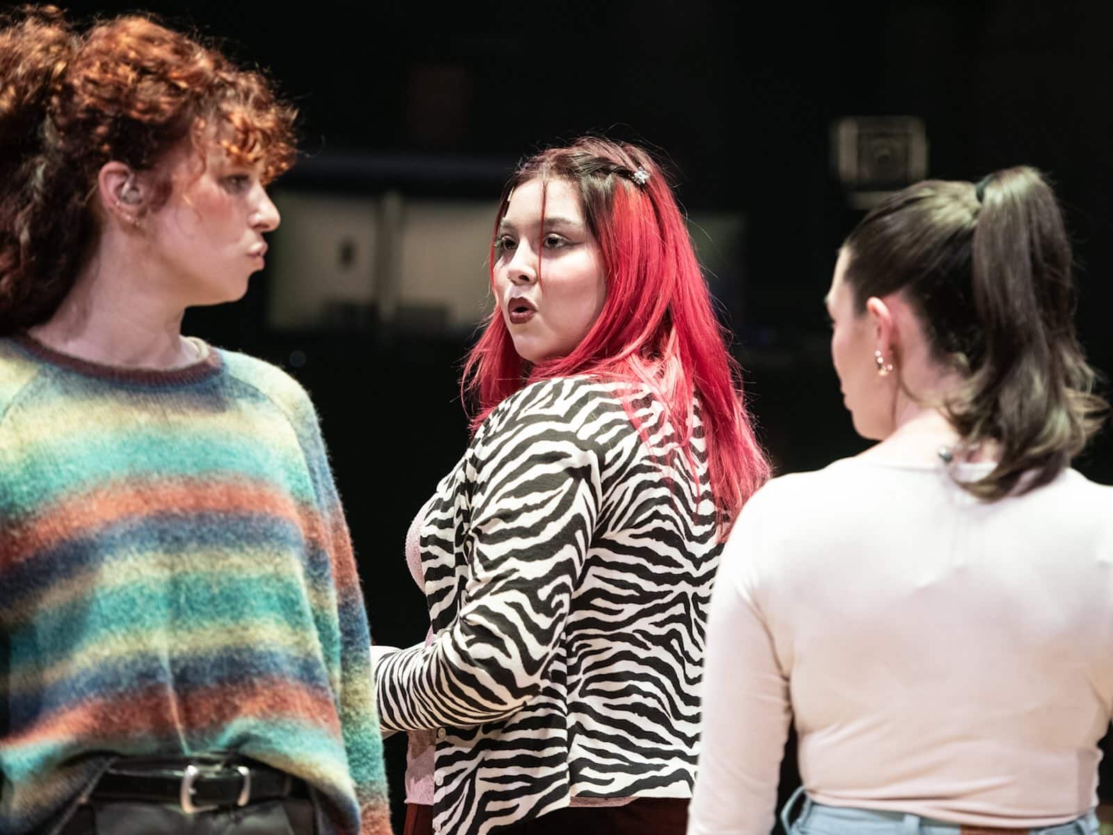 One of Studio’s largest innovations in Octet is its depiction of Velma. Costume designer Moyenda Kulemeka leaned into a Y2K “WitchTok” aesthetic, with Velma’s outfit composed of garments in lavender, magenta, and mauve — all accentuated by silver jewelry and a Zebra-print jacket. It’s a far cry from other productions of Octet, which have often dressed Velma in muted colors, but Aguilar thinks her outfit is motivated by her character.