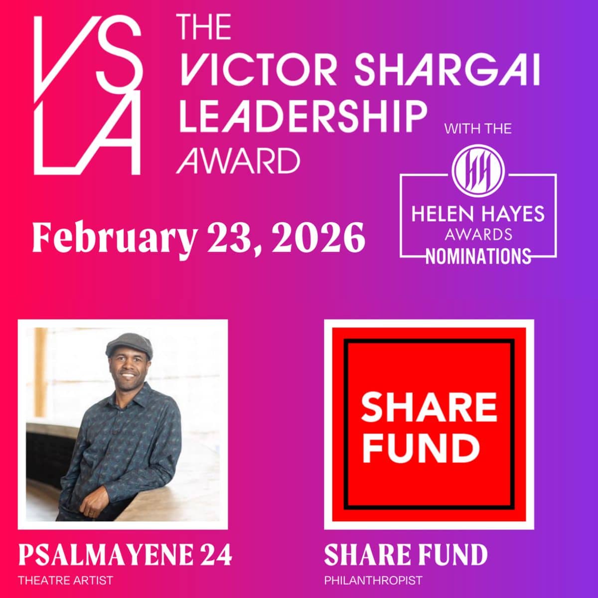 The Board of Directors and Advancement Committee of Theatre Washington, in partnership with Craig Pascal, community advocate and husband of Victor Shargai, are thrilled to announce the recipients of the 2026 Victor Shargai Leadership Award: award-winning playwright, director, and actor Psalmayene 24 and philanthropist and theater champion Share Fund, with leadership by Julie Jacobson and Pamela Nash.