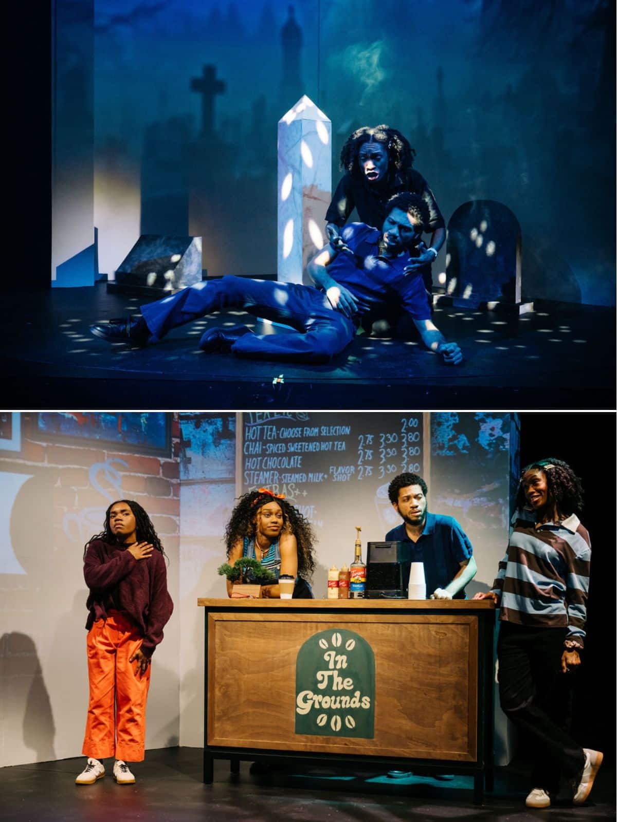 The play begins in a cemetery, where motion projections by Jeremy Bennett depict an expanse of graves beneath windblown trees, while lighting by Niya John, sound by Brandon Cook, and stage fog evoke an eeriness into which a young woman named Zia enters to visit one of two adjacent grave stones. Zia (played by Ariana Caldwell, emphasizing the character’s definitional social anxiety) strikes up a self-conscious, one-sided conversation with someone deceased. The scene ends with an abrupt jump scare as Doe, a young man’s ghost, appears.