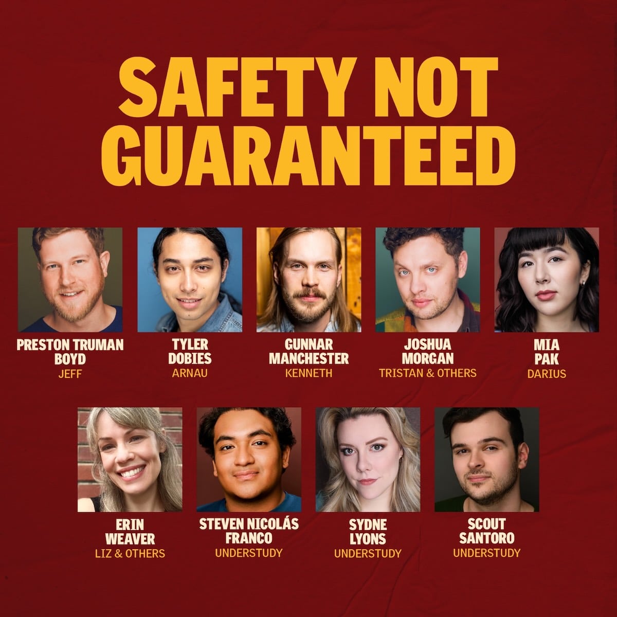 The cast of Safety Not Guaranteed includes Preston Truman Boyd (Broadway’s Kiss Me KateThe Play That Goes Wrong) as Jeff, Tyler Dobies (Signature’s The Untitled Unauthorized Hunter S. Thompson Musical, Olney Theatre Center’s Frozen) as Arnau, Gunnar Manchester (BAM’s Macbeth in Stride, Hudson Valley Shakespeare’s Octet) as Kenneth, Joshua Morgan (Broadway’s Ain’t Too Proud, Signature’s Soon) as Tristan/Others, Mia Pak (The Public’s Suffs, Lincoln Center Theater’s In the Green) as Darius, Erin Weaver (Signature’s A Funny Thing Happened on the Way to the ForumPrivate Jones) as Liz/Others. Steven Nicolás Franco (Signature’s In the Heights), Sydne Lyons (Studio Theatre’s Octet), and Scout Santoro (Glimmerglass Festival’s The Pirates of Penzance) are understudies.