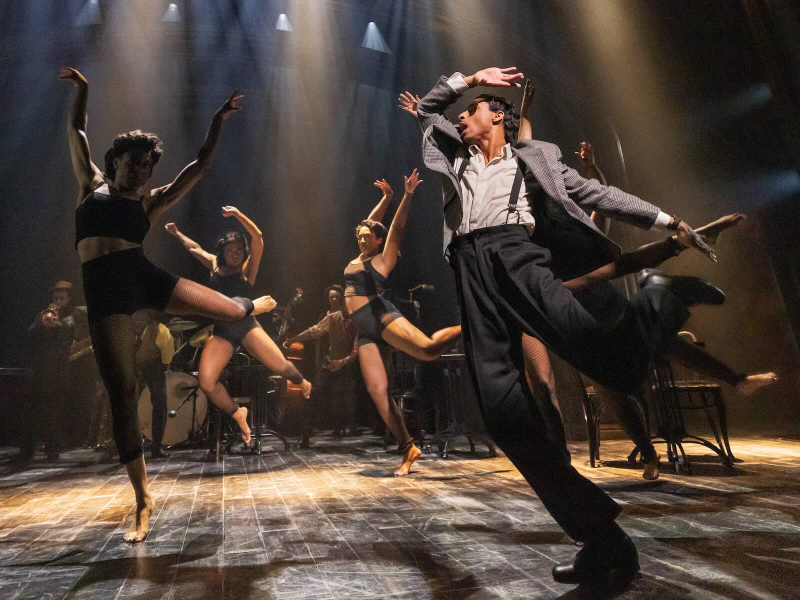 This is not Broadway “grin and shuffle” tap, and there’s no metal on the shoes. Glover, like all rhythm tappers, considers himself a musician first. The beat and syncopated variations tell this story of living as a Black person in America in an elemental way, alongside the dialogue and music. The excellent musicians, who skillfully riff in the call-and-response of jazz, include Lafayette Harris Jr., Corey Rawls, Daniel Bereket, Nolan Nwachukwu, Jalin Shiver, and Alex De Lazzari. The women dancers, some short and curvy, others long and leggy in their heeled LaDuca dance shoes, are Charis Michelle Gullage, Kalen Robinson, Ndaya Dream Hoskins, Alana Thomas, and Brooke Taylor. They’re the club’s nightly act, a few steps removed from burlesque. Their routines, save for a dance sequence leaning into African forms, strive for a studied, unified presentation.