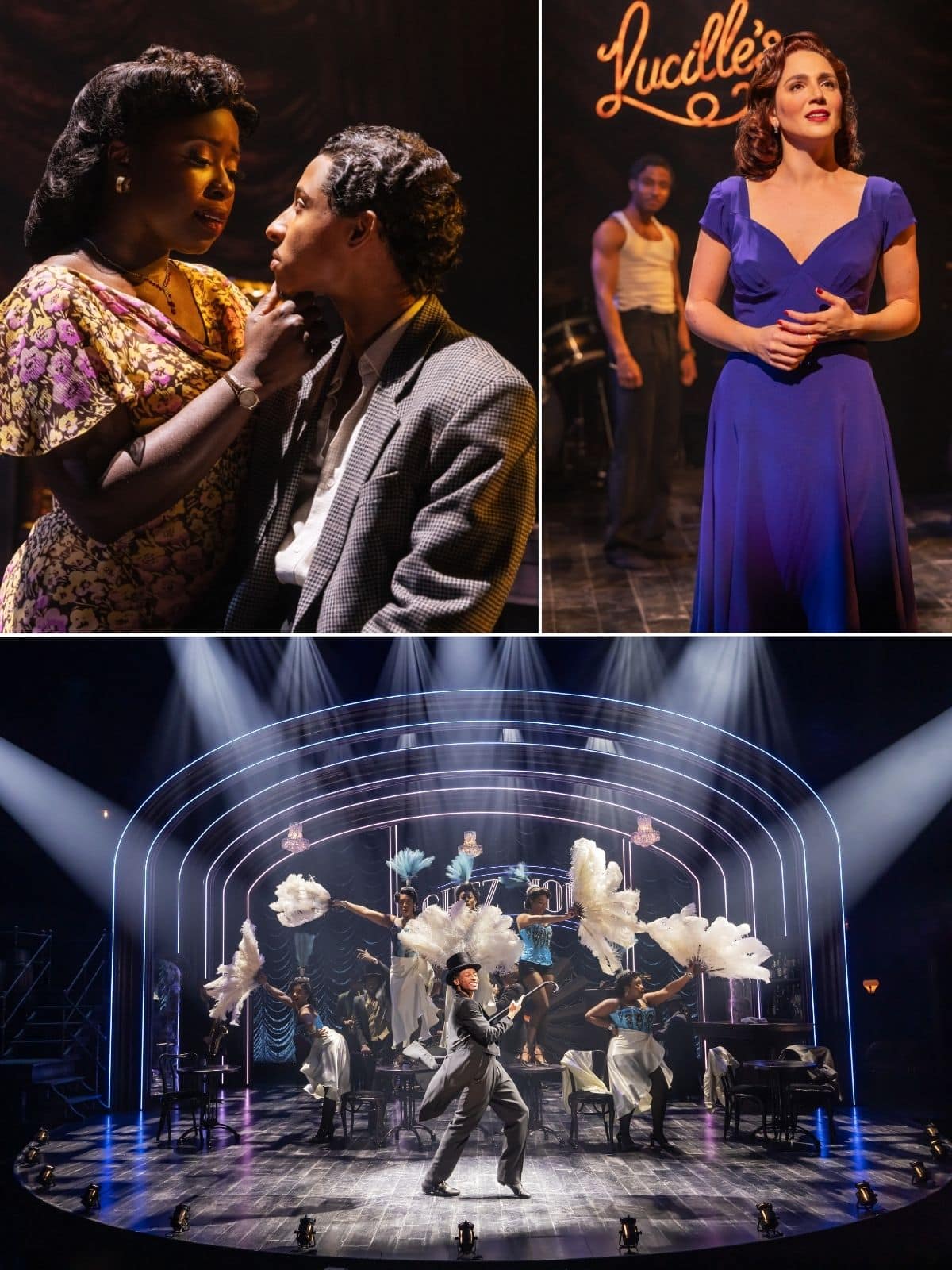 Derek McLane’s Act I set, with its simple bar and tables, with the musicians on stage and basic scalloped show curtain with the moniker Lucille’s, transforms into a ritzier setting in Act II. But in the intimate Kreeger Theater, space is at a premium, and elaborate settings would overshadow the show’s core focus on song and dance. Emilio Sosa’s costumes are richly colored and tailored for that 1940s style. The men sport bowlers — a nod to “Bojangles” Robinson and other tappers and sharp suits; the women wear dresses and heels or era-appropriate rehearsal attire. J. Jared Janas’s wigs replicate the processed styles favored by African American women and men up North.