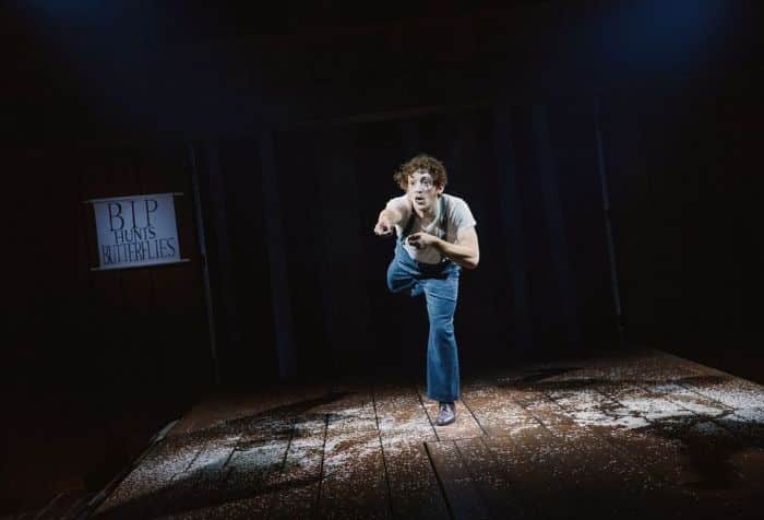 Co-written by Marshall Pailet, who also directs, and Tony Award nominee Ethan Slater, who stars as Marcel, the real-life events are presented with imagined details and conversations through an inventive and highly entertaining incorporation of Marceau-inspired pantomime into the emotionally engaging narrative (with Lorenzo Pisoni serving as movement consultant). Slater’s stellar performance manifests both his outstanding talent at empathetic characterization and enactment, and his impressive expertise at miming and physical comedy from the moment he takes the stage, with the silent sequences delivering the affecting story as clearly as the spoken-word scenes (the hand-mimed drooping flower and fluttering butterflies, with the supporting cast joining him, are especially uplifting metaphors). It’s an award-worthy performance that elicits laughter and tears, and leaves us knowing, respecting, and caring much more deeply about the man he honors.