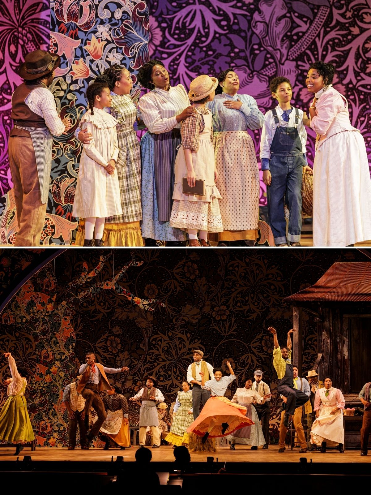 A last note about the decision to simplify design elements. I thought it was a good, if necessary, one. This was not meant to be “grand opera.” The entire story played against two staggered backdrops. Set designer Lawrence E. Moten created a colorful floral pattern downstage that gave a nod to William Morris and the period of his fabric design. Upstage, a second backdrop featured a monochromatic deep indigo-and-off-white pattern reminiscent of classic batik from Asia or perhaps Africa. The only other scenic elements were the magic tree, which symbolized nature and our necessary stewardship, and a small one-room cabin façade, reminding us of the precarious lives eked out by Blacks in the rural South during the years of failed Reconstruction and the years Joplin witnessed. Lynley A. Saunders followed suit in the simplicity yet functionality of the costume design. Nothing overpowered the singers and the storytelling.