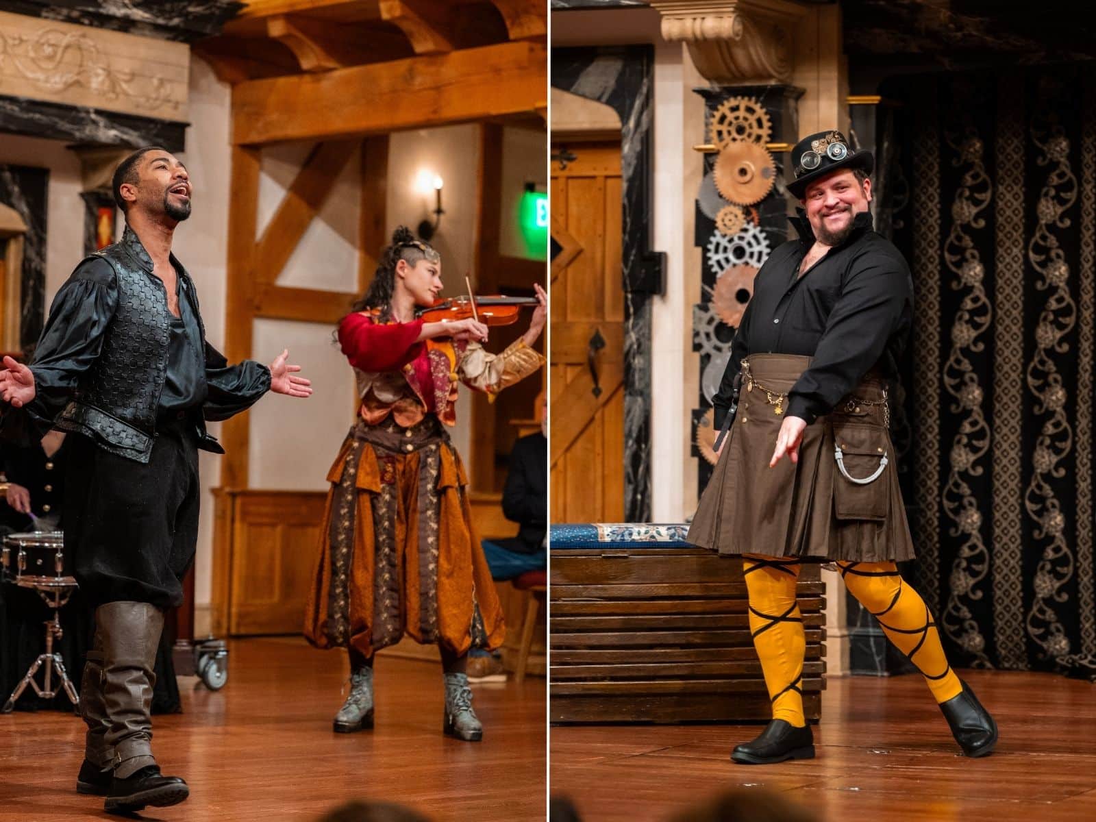 In harmony with the gear-and-cog motif on the stage’s columns, costume designer Elizabeth Wislar decks out the cast in Clockpunk gear (topped off by begoggled hats), when not managing to blend certain costumes with the stage curtain to brilliant comic effect. And the musical selections range from the joyful — Seiler leads the house with the Doobie Brothers’ “Listen to the Music” and Barry Gordy’s “Money” — to the contemplative, with Darin F. Earl II’s soulful “Man of Constant Sorrow.”