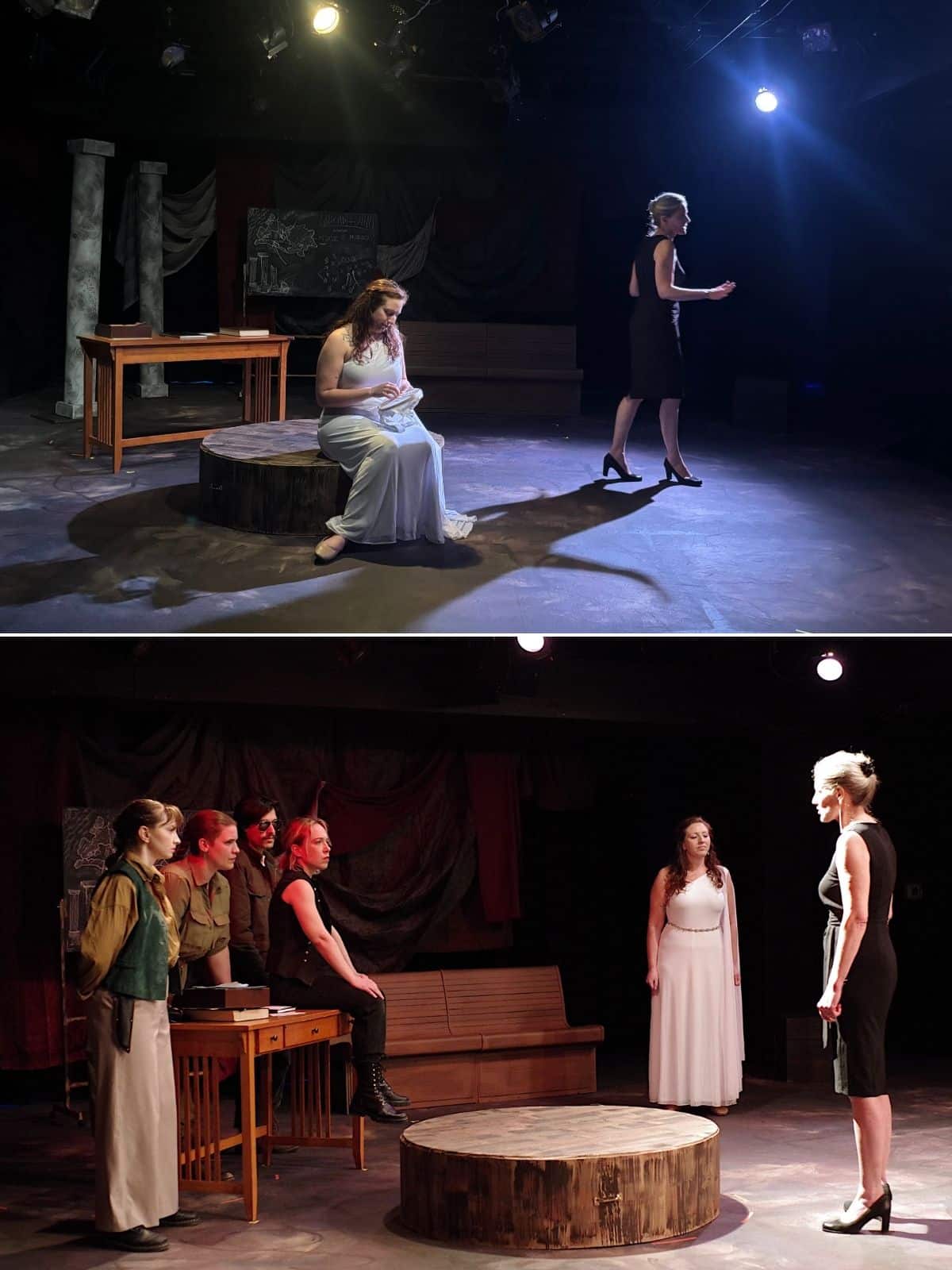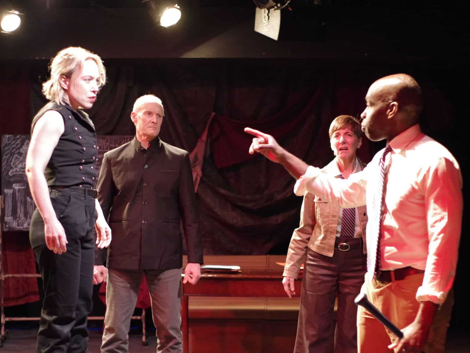 Gee takes the play in a different direction. Her Coriolanus, she says in her director’s note, “centers queer and female voices to examine how power is performed through gender.” This she accomplishes primarily by casting women (Brianna Goode and Erin Nealer, respectively) in the key roles of Caia Marcius (given the honorific “Coriolanus” for her role in the war) and Aufidius. This is not a totally unique idea. There was a 2026 Theater for a New Audience production in New York that cast a woman as Aufidius, for example. A Portland, Oregon–area theater did an all-female cast version of the play in 2016.
