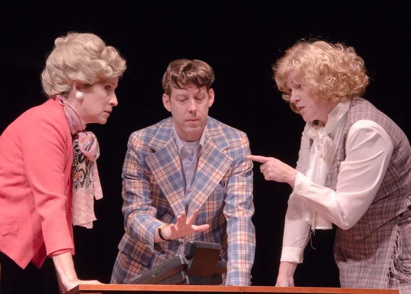 All the designing aspects of the production are highlighted with this scene. The wigs and makeup (Hannah Wolf and Robin Parker) and wardrobe (Rebecca Fischler) effectively set the tone with the perfectly detailed looks and feel of 1970. The sound effects and lighting designed by Ken and Patti Crowley – playfully bounce back and forth in unison – from one ringing phone to an actress answering the call, to another ringing phone and an actress juggling a call back and forth among the three – in a three way phone conversation.