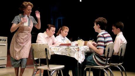 Deborah Hazlett, Connor Aikin, Corrieanne Stein, Christopher Cox, and Noah Chiet in Olney Theatre Center’s production of ‘Over the Tavern.’ Photo by Sonie Mathew.