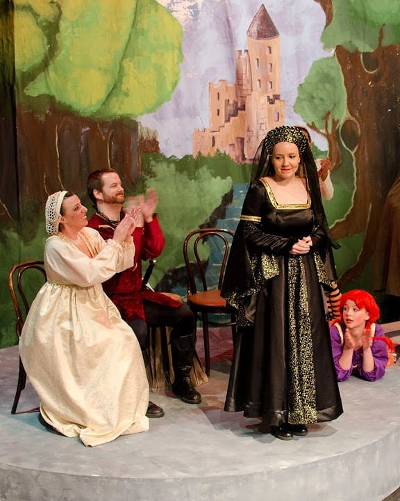 This production provides a mixed bag of performances: some are fantastic, others quite rough. However, the cast is an enthusiastic one, and encourage the audience to shout their support (or displeasure) throughout the show, which they do so happily. Standout performances include Mary Frances Dini as the Sheriff’s Wife, a silly woman who is obsessed with climbing the social ladder while pulling her unrefined, wacky daughter Salome (Ann Kutyna) along behind her. The duo is greatly entertaining, and Dini is especially interactive with the audience, showing them a playful and friendly energy. Fight Choreographer Jim Campanella leads the actors in several fight scenes (at one point, playfully using light sabers instead of swords) which can get a bit cramped and clumsy due to the large cast and small stage, but it was still enjoyable.Worried about providing entertainment for a group of children with a large, varying scale of interests? Taking them to see Robin Hood is a good choice.With bandits, sword fights, swashbucklers, and merriment, there is something for every child to enjoy!