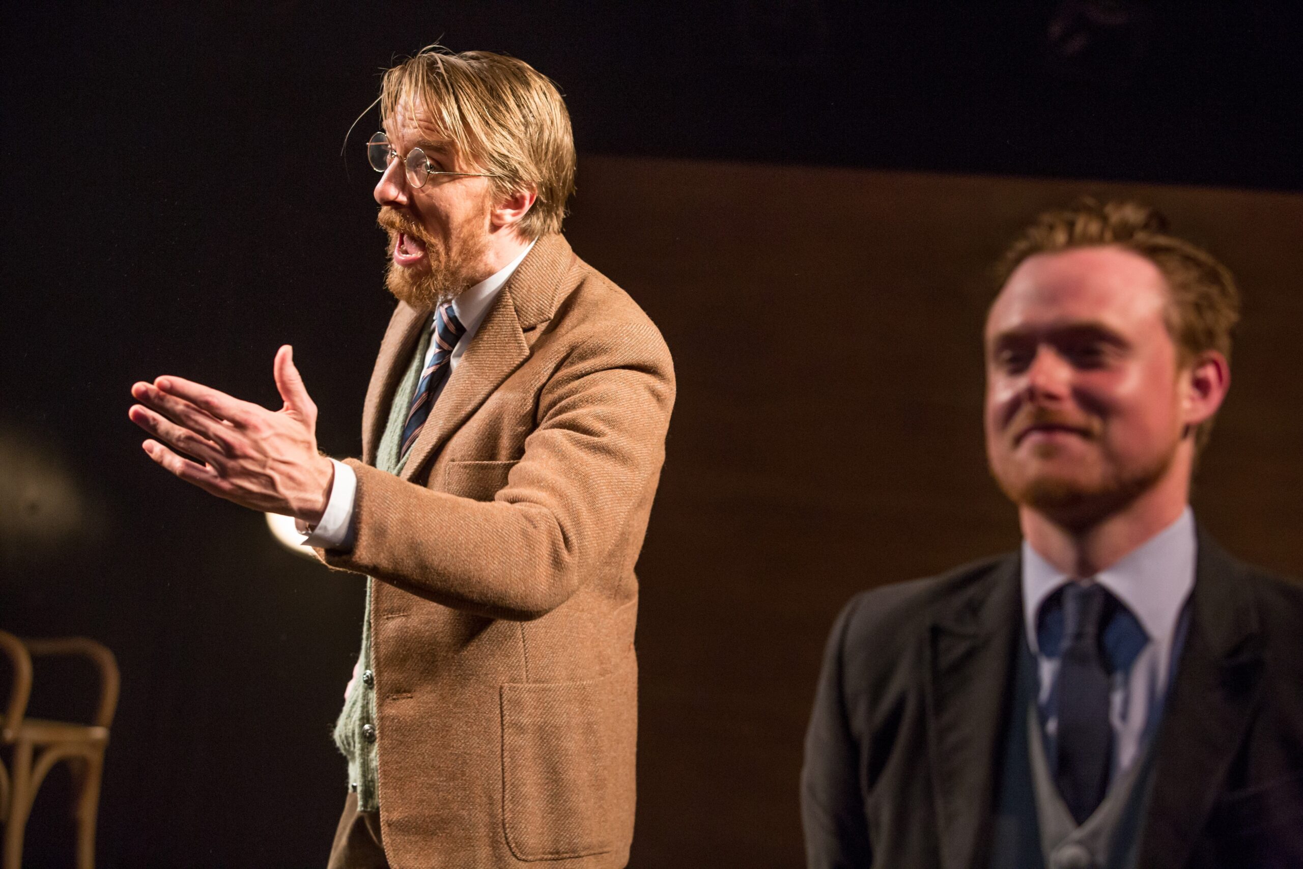 Brittany Vasta’s sparse post-modern scenic design of four platforms and a back wall in blond wood is furnished simply with movable wooden chairs, a floor lamp, and vintage typewriters, allowing for the unencumbered clarity of Wise’s impactful blocking and subtly accentuating the play’s timeless import. Costumes by Christopher Metzger also smartly suggest a synthesis of Ibsen’s era with our own, and lighting by Drew Florida includes an evocative noir-inspired opening, with the actors silhouetted in the darkness of haunting backlighting.