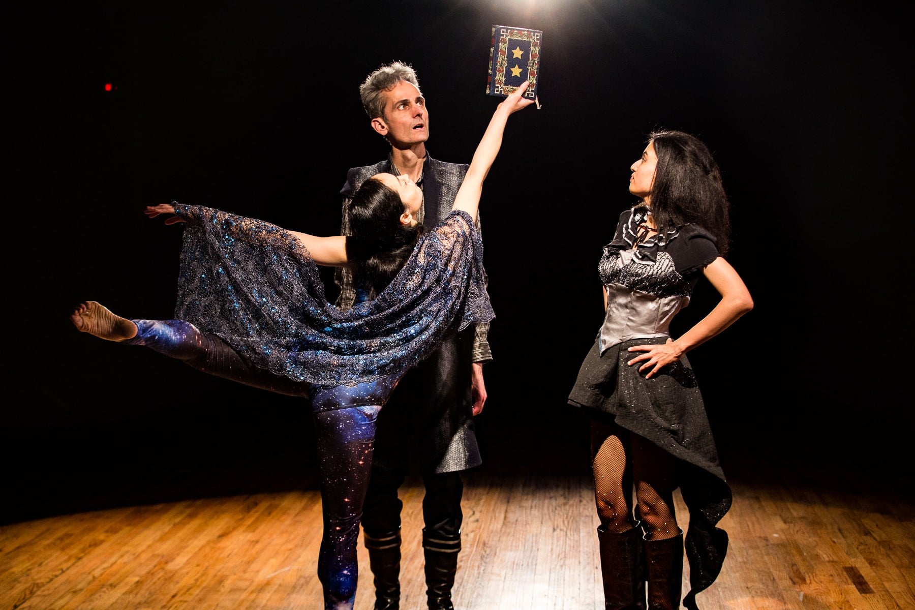 Highlights of the show include the original otherworldly music composed by live musicians Topu Iyo and Mike Thies, and sung by cast members Erkin Osmanli, Gillian Bennett, and Michelle Tsai (the duets by Osmanli and Bennett are especially evocative). Dancers Yukari Osaka, Mizuki Sato, Emily Morrison, and Laura Bowers execute Susan Tenney’s seemingly weightless choreography with exquisite grace, beauty, and fluidity, as they float through the space (accentuated by Janet Mervin’s cosmic costumes) and impress with their stunning extensions. All of the musicians, singers, and dancers succeed in setting a haunting mood that transports us to another realm.