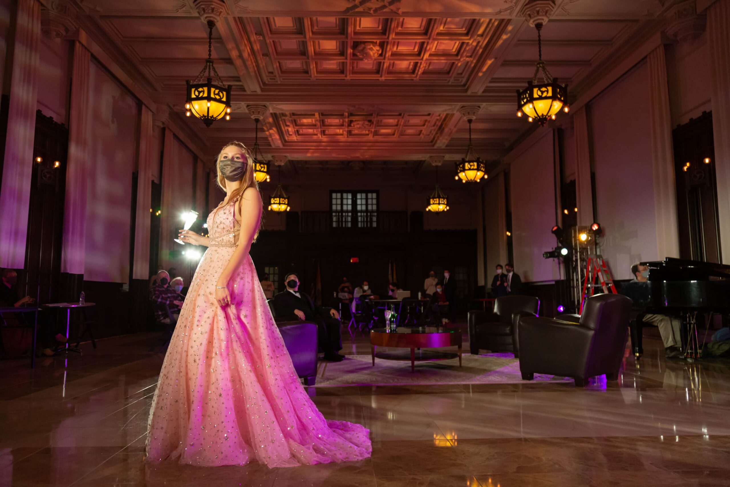 During Act II, Orlofsky (Sophia Pelekasis) emerges in a resplendent pink gown. Adele (Natalie Barsoum), a lowly servant, has taken one of her lady’s dresses and has come—in disguise—to Orlofsky’s party. Barsoum’s performance of the aria “Mein herr marquis” (colloquially known as “Adele’s Laughing Song”) provides a bright pop of humor, in addition to her bouncy melody. Throughout the show, the students prove their acting talent when in the spotlight. While Die Fledermaus lacks some of the over-the-top sentimentality of its contemporaries, it can still fall flat when performed by singers who don’t buy into the premise.
