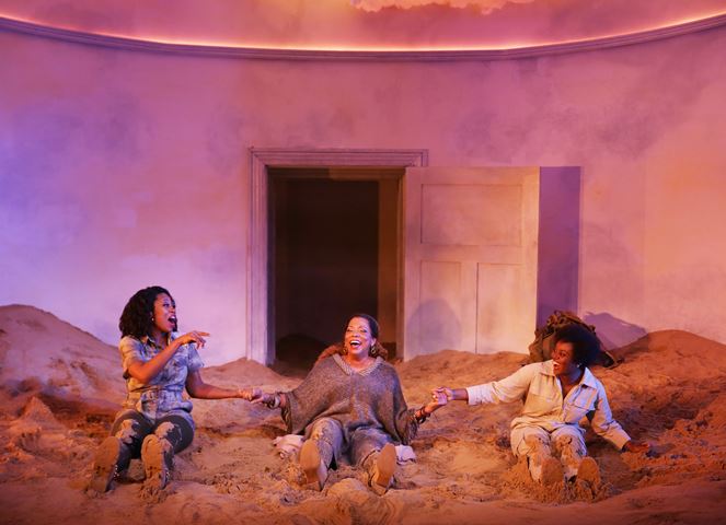 Set on a stage featuring 35,000 pounds of sand, three doorways around the spherical enclosure, and a sky filled with fluffy clouds above (scenic design by Matt Saunders), the artistic design of the play is in perfect conformity with the existentialist theme of our earthly life. Lighting by Stacey Derosier and sound by Sadah Espii Proctor underscore the characters’ shifting moods, with costumes by Montana Levi Blanco and hair and wig design by Cookie Jordan that define them. And especially significant in the metaphorical representation of the women “falling apart” are darkly comical props (with supervision by Matthew Frew) that heighten both their fear of aging and death and the laugh-out-loud absurdism of the work.