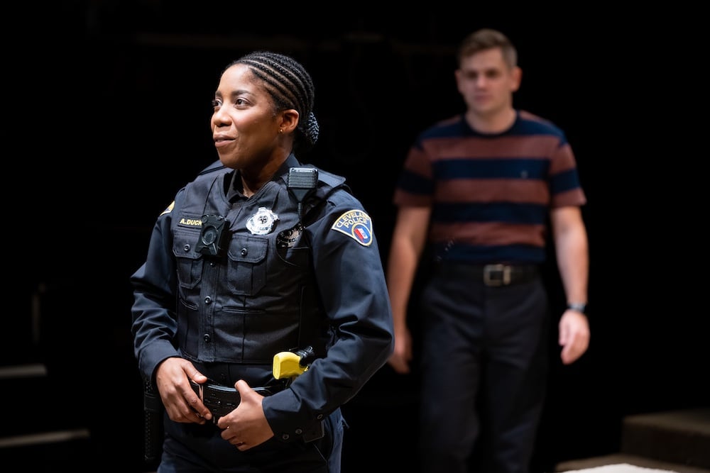 It’s a two-character piece: Amina (Sarah Ellen Stephens) and Ryan (Doug Harris). She’s Black. He’s white. They are in love. They are both dedicated to their jobs as Cleveland police officers, seeking to do some good amidst the “ugly” of the city’s boarded-up buildings and potholes and poverty and violence.