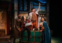 While centering a story around music the way a record spins out songs is nothing new, audiences this time around get to be as close to the story as the flyers on the walls. Sharing the same space as the characters provides a new perspective, and the audience experience verges on neighborly voyeurism. It incites “the sense that you’re eavesdropping on life as it is being lived,” notes Bogie (Andy Brownstein), which “amplifies the illusion that you are witnessing something spectacular that grows out” of the location. Heightening things further, the audience’s own lived experiences are apt to swirl up musically around them; after all, the characters’ happenstance meeting unfolds in a place Saldaña describes as “space imbued with appreciation for music, vinyl…and the memories of being in a record shop,” one that “some people [revere] like church.” Moreover, the store’s built-in histories couple with the realness of the environs, which “gives you a different flavor,” according to Brownstein, while its closeness “changes the immediacy.” Saldaña (who also plays Zane) elaborates that the store itself “adds a nice jumping off point as a performer”; though the close quarters create some challenges in terms of staging, it provides the exciting tradeoff of having “a strong additional character in the story.”