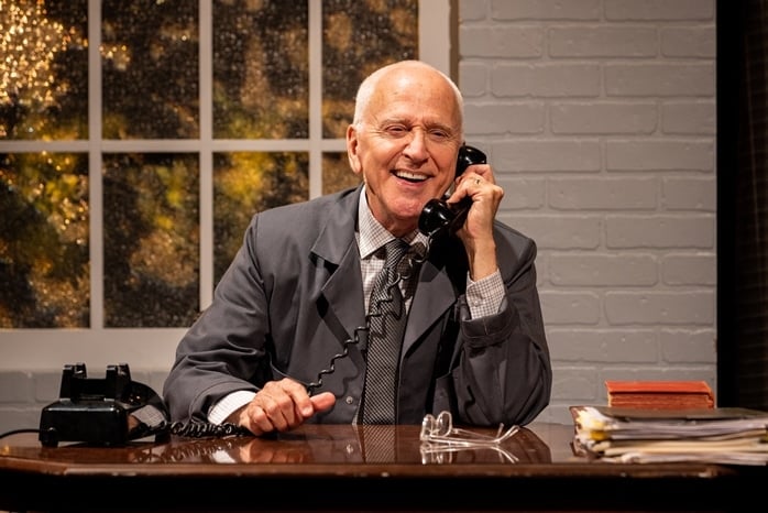 Rubinstein’s thoroughly convincing, passionate, and captivating embodiment of Eisenhower is supported by apropos business and casual clothes of the era (with Sarah G. Conly serving as costume consultant), a tastefully appointed scenic design (by Michael Deegan), with period-style furnishings and props (including an over-sized vintage tape recorder and rotary-dial desk phone), and projections (by Joe Huppert) on the back wall of the set that show the expansive grounds and golf course of the Eisenhower Farm, changing light and weather that shift with the time of day and moods (from a sunny sky to a foreboding thunderstorm), and old black-and-white photos of Eisenhower and the well-known people and family members he discusses. They are enhanced by a natural lighting design (by Esquire Jauchem) and sound (by Huppert) that includes voice-overs of speeches at the beginning of each act before Rubinstein enters the stage.