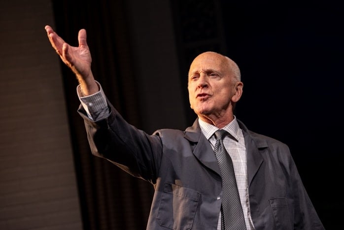 And he does it all with total fluency, concentration, and expressiveness, while moving actively around the stage, taking phone calls, pouring himself a cup of coffee or a drink, shifting his emotions from angry and frustrated to contemplative, nostalgic, and loving, from satisfied with his achievements to regretful about his decisions, and always committed to his ideals, as conveyed in his face, gestures, and body language, and the tone of his voice.
