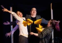 “Competence” is the best word for the entire production, in fact. All the actors are on point for their characters, their accents are credible, and director/lighting and set designer/theater owner Justin M. Kiska keeps the pace running smartly. His set is a well-appointed, comfortable drawing room in a prosperous village house, with doors that serve the plot effectively (only two; this is a mystery after all, not a farce). It fits neatly into the modest dimensions of Way Off Broadway’s stage.