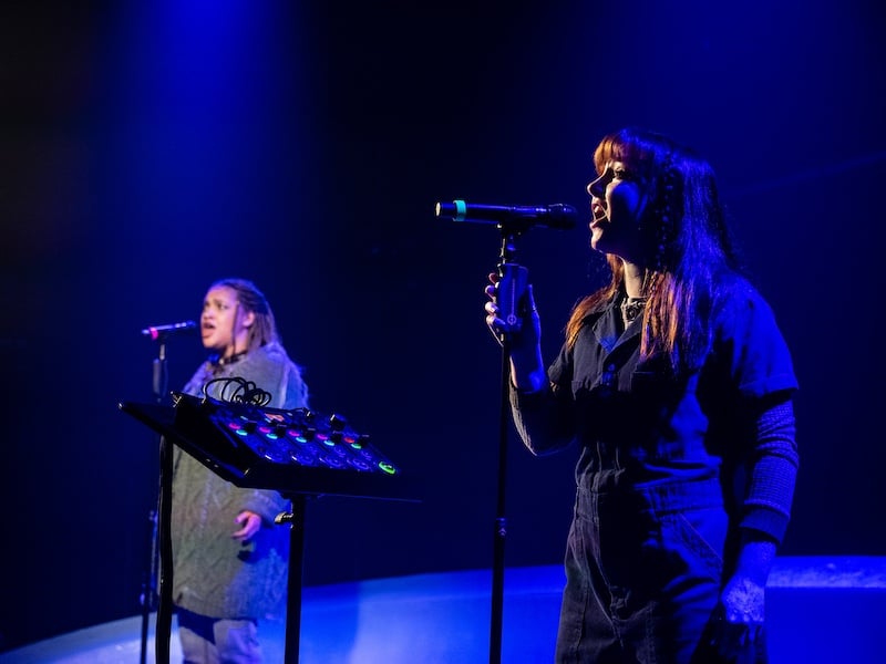 Stenson and Julia Murray). Their remarkable voices, without instrumentation, carry the entire acoustic landscape of Islander, which was conceived by Amy Draper, with music and lyrics by Finn Anderson. (The simple, evocative set design, recalling shoreline, tidal pool, and perhaps a whale’s blowhole, is by Emma Bailey.) In a process called live looping, Islander’s actresses record themselves creating various sound effects in front of the audience, then play those back throughout the show, producing a multi-layered soundscape over which they sing. The result is a unique soundtrack of haunting melodies and syncopated interludes mixed with the cries and calls of the sea.