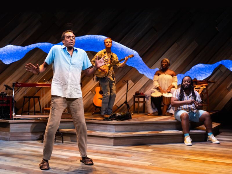 Staged like the folk music concerts in those back bars that Jonah (protests he) dislikes, the scenic design by Tony Cisek is a simple raised platform, a fourth wall within a story in a round. But for me, the standout element was the beautifully inlaid and lit river that traced the top of the walls of the space. As alive as the story and as fluid as the music, it was a literal and artful throughline to the tale unfolding. Choreography by Dane Figueroa Edidi, music direction by Rob Morrison, costume design by Moyenda Kulemeka, lighting design by Harold F. Burgess II, and sound design by Eric Norris all gently layered on top of each other, not calling attention away but enhancing the world being built on stage and in the minds of the audience members.