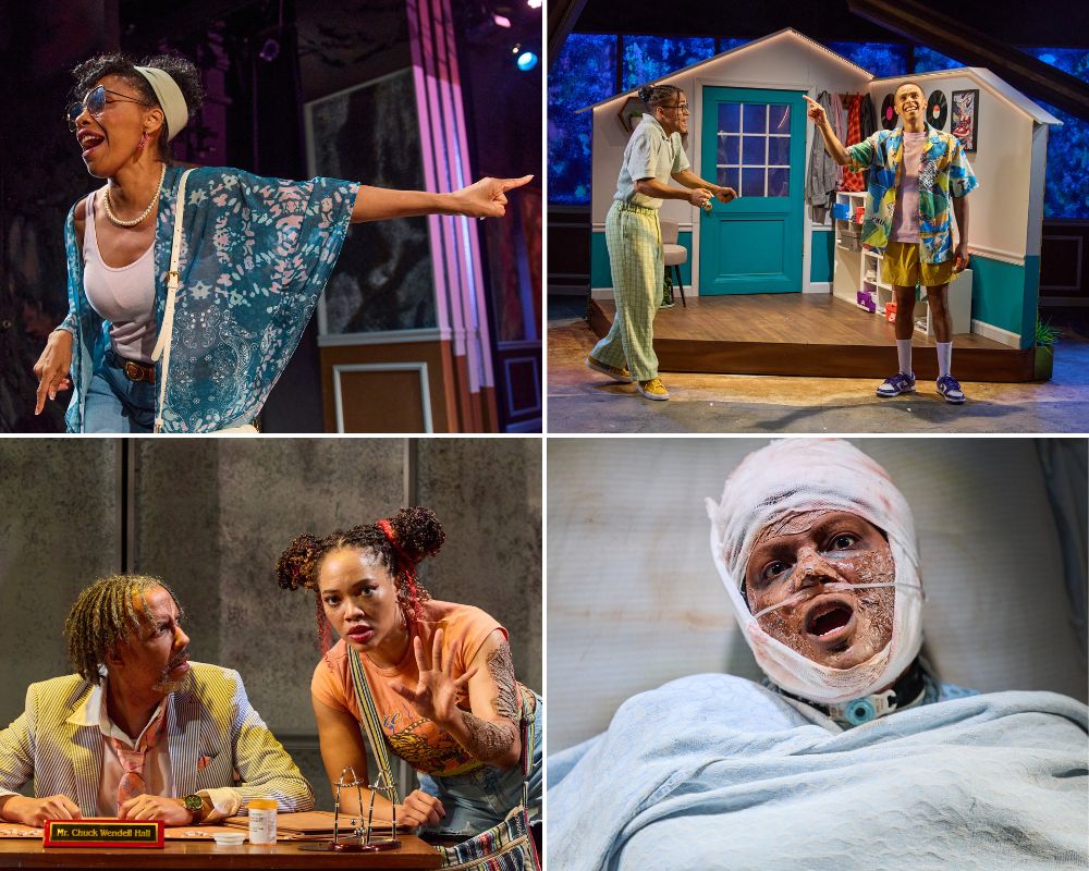 The play’s heady mix of drama, narrative storytelling, dance, and shadow work is ably executed by the ensemble. The standout supporting player is Joy, who utterly dominates the space from her upright hospital bed with an intensity perfectly measured to be as hilariously overwrought as it is genuinely horrifying. In a punishing monologue, Joy lays out the trauma suffered at the hands of her lover, touching near-biblical heights while setting the darkly comic tone that shapes the play. Nestled in that range are Johnson’s gleefully bananas turn as Chuck, the fussy disillusionment in Roger’s housewife Angie, and the (sometimes overly) obnoxious teen energy in Ford’s Scotch and Hart’s Riley. EL’s father, sporting a literal black hat straight out of an old TV western, is a fittingly aloof counterpoint to his zany friends, lovers, and progeny.