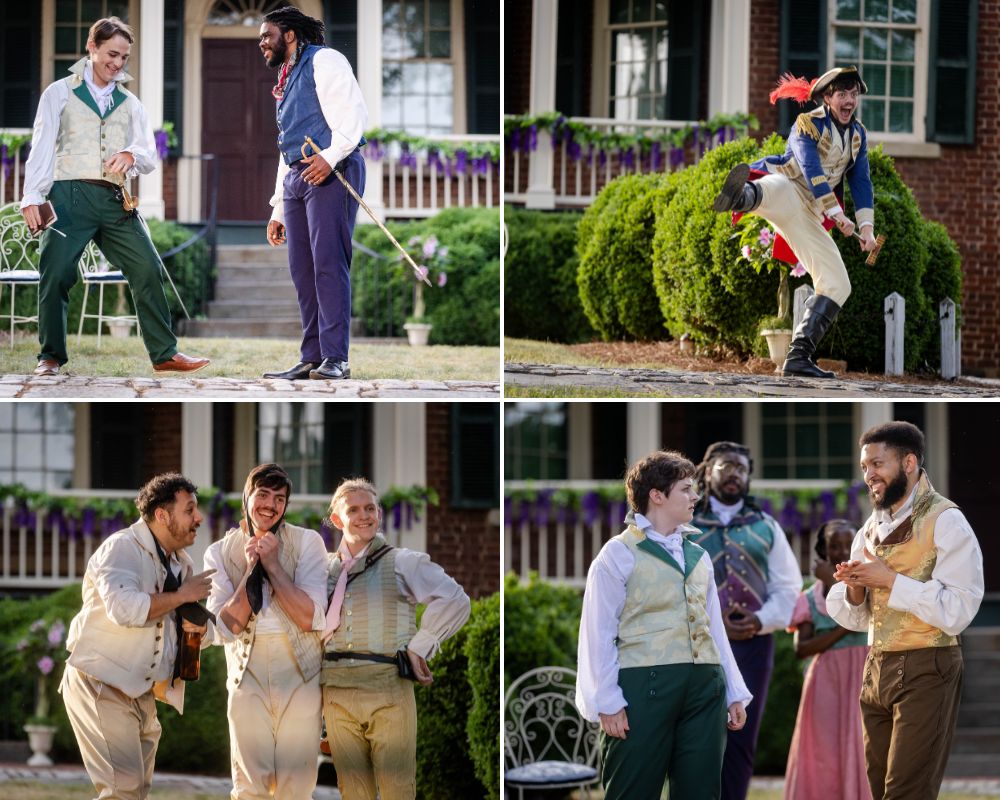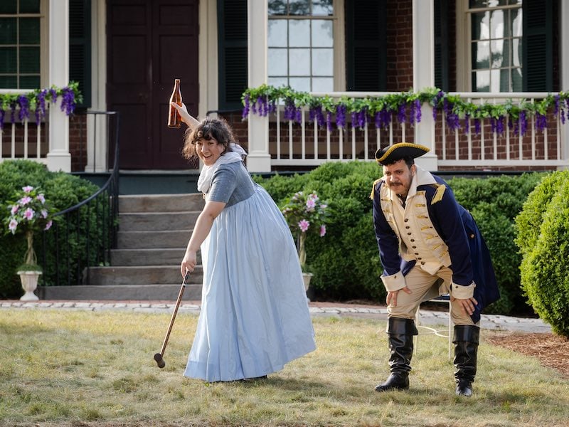 Director Alaina Smith, in a stroke of genius, has chosen to stage this production in Regency style, costumed in early 1800s fashions that fans of a certain (ahem) hit Shondaland series on Netflix will instantly recognize. Savannah Bower has decked the cast in uniform and Regency-period gowns (depending on how the character chooses to be ID’d). And where better to stage it than the grounds of Hope Point, a 200-year-old mansion sitting atop one of Lynchburg, Virginia’s legendary seven hills? The mansion provides a natural setting as Olivia’s own household, with actors entering through the front doorway and generally running around the grounds.