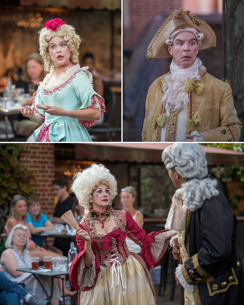 Sally Boyett does the costume and sound design, creating outfits reminiscent of 17th-century France, with wigs, vests, and jackets for the upper-class men, and dresses for the women. She also throws out funny sound effects, including a crow cawing at certain amounts of money and Spanish music for the mentions of Senor Anselme. As director, Boyett keeps the actors constantly moving, whether circling each other in conflict or frantically racing on and offstage. They also engage the audience in various ways, such as going around with (empty) bottles in preparation for a party. Along with the delicious food and drink at Reynolds, The Miser makes for a lovely evening of comedy.