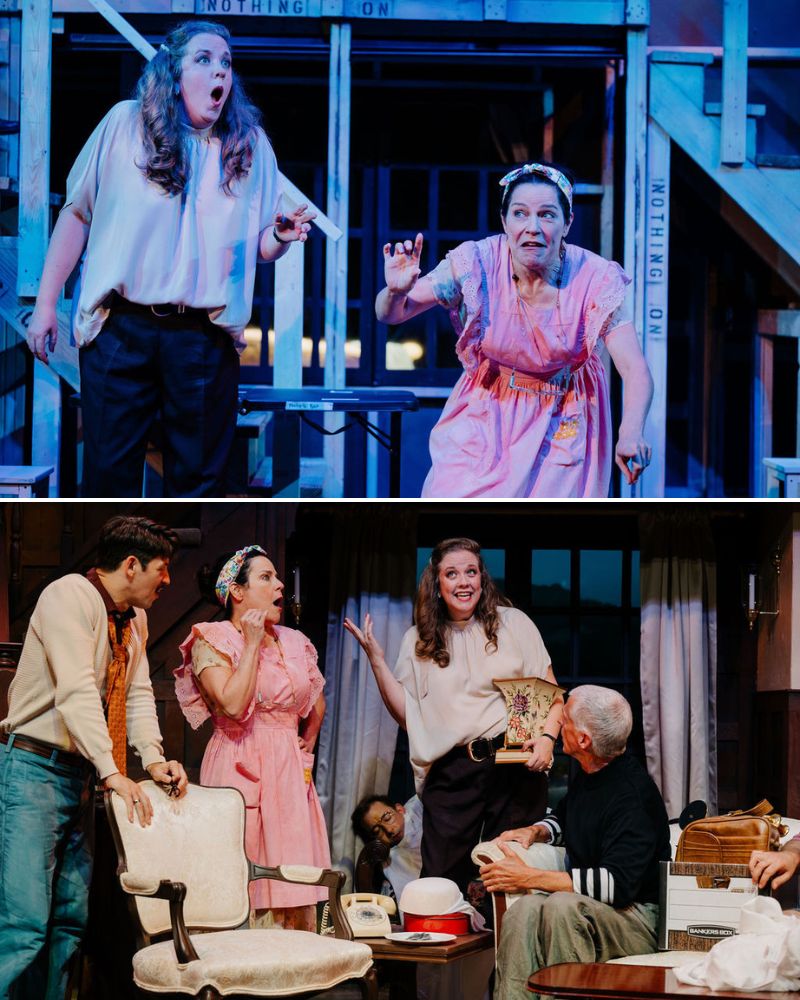 TOP: Valerie Adams Rigsbee and Susan Marie Rhea; ABOVE: Ryan Sellers, Susan Marie Rhea, Valerie Adams Rigsbee, and Timothy H. Lynch, in ‘Noises Off.’ Photos by Cameron Whitman.