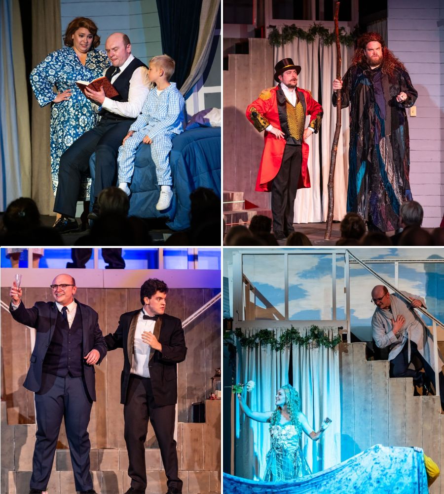 The Ensemble play multiple roles, from the Witch’s assistants to USO performers, as well as individual characters. Mary Zajic brings a deep love to Josephine, Will’s wife, seeing the emotional truth of Edward’s fantastic tales. Davis Wootton-Klebanoff plays circus owner Calloway as a charmingly cynical huckster, slyly cutting down auditioning performers. In “Closer to Her,” he drops hints about Sandra to Edward, all the while scoffing at love. Emily L. Sergo brings a power to the Witch. In “I Know What You Want,” she sings of Edward’s greatest desire. Jeremy Limansky brings an anger to Don, Edward’s town rival, reacting to bad news with violence. Connor Bland gives great comic timing to Karl the Giant, coming off intimidating at first but revealing a humorous side. Kaitlin Fish gives a captivating mystery to the silent Mermaid. Scott Benedict brings a quiet strength to Dr. Bennett. Ellen Quay helps reveal another side to Edward as Jenny Hill singing in “Ashton’s Favorite Son” of his greatness while giving a poignant moment in “Start Over.” Kirsti Bennett, Samantha Curbelo, Reagan Davey, Danielle Kellner, Sydne Lyons, Jayden Maduro, Colleen Prior, and Nicole Ricucci complete the Ensemble.