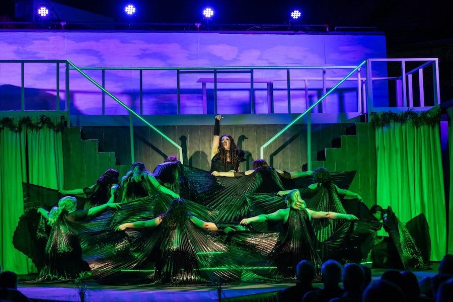 Lighting designer Eric Hufford highlights the show’s different emotions with lighting effects. For the Witch’s appearance, a green light flashes on the stage. During tender moments, the lights dim, spotlights shining on the singers. Sound designer Dan Caughran throws out sound effects like rain falling.