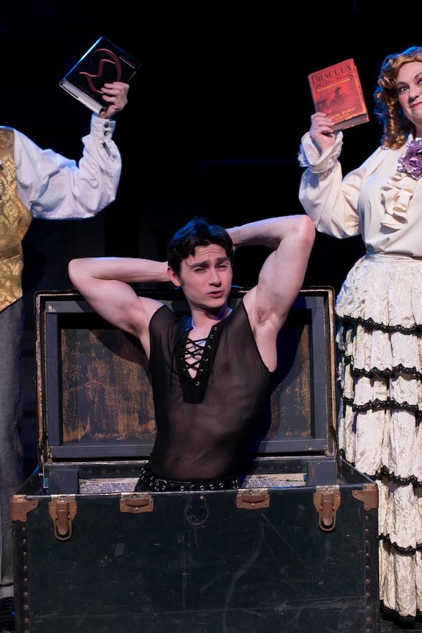 The script has switched the roles of Lucy and Mina from their roles in Stoker’s novel, for some reason: Harker’s fiancée is Lucy, and Mina is the one with limited romantic prospects. Maybe there was a smart joke wrapped up in there somewhere: I missed it if so. That said, Hope Cassidy is a fantastic Lucy, being utterly immersed in her line delivery and believably in love with the adorable Seth Drenning as Jonathan Harker, who plays the Nervous Little British Guy stock character with such archetypical accuracy that his performance becomes wonderfully satirical. When he and Dracula have one-on-one, subtext-laden exchanges, you feel like you’re watching Good Omens.