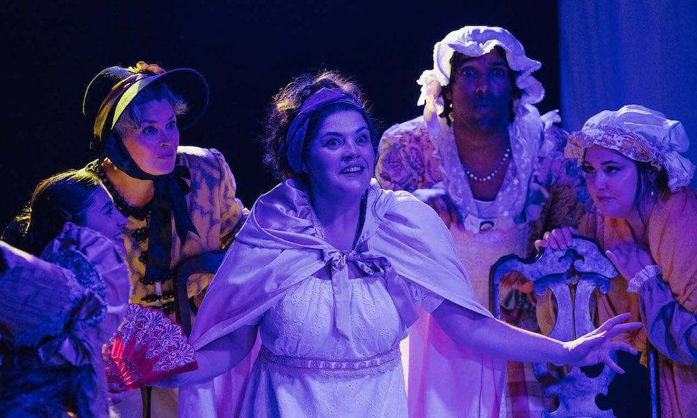 Speed and motion. These are the predominant features of the Maryland Ensemble Theatre (MET) production of Kate Hamill’s adaptation of Jane Austen’s Sense and Sensibility. Actors briskly wheel in set pieces for the frequent scene changes. Gaggles of gossips — actors in the ensemble embodying the toxic social milieu of early 19th-century landed-gentry society — swirl and natter. Dinner gatherings, replete with genteel sniping and misunderstanding, proceed at an Aaron Sorkin-like pace.