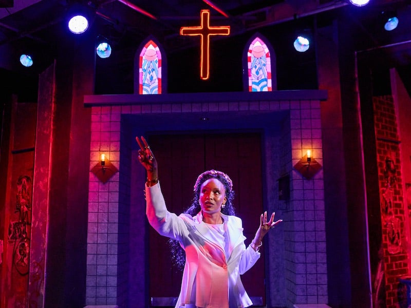 Crack cocaine figures prominently in Hampton’s quirky storyline as his title Cracking Zeus foreshadows, and the illicit substance’s power to induce something like religiosity is also implicit. At the top of the play, we meet an unhoused character named Rufus, flying high on crack, who sleeps on the street outside the church front and becomes a kind of counselor to Baniaha. DeJeanette Horne plays Rufus with a raw, restless mania that’s magnetic.