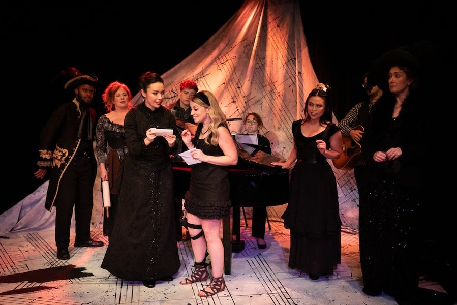 For the opening, each performer enters in a costume from one of the shows, so from the outset we’re all anchored in the wonderful world of Sondheim, thanks to costume and set designer Margie Jervis. From “Saturday Night” to “A Weekend in the Country,” everyone mills around connecting with each other as friends on a stroll. From there, several peel off until Sumié Yotsukura with full-bottomed back bustle (that she fiddles with playfully) hits her musical stride by sitting perfectly still while posing for “Sunday in the Park with George.” Katie McManus wields her trusty rolling pin for “Worst Pies in London,” and Molly Rumberger delivers an impeccable “Getting Married Today” from Company. Both Erin Granfield and Ricky Drummond deliver rock-solid and masterful performances, Kiana King relays a depth of meaning, and Trenton McKenzie Beavers and Ben Ribler are adorably self-absorbed Princes with their “Agony” from Into the Woods. The characters pair up, jostle,