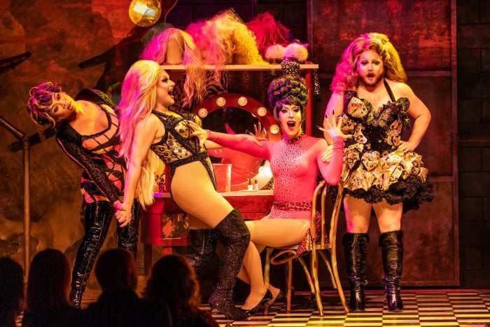 Directed and choreographed by Spencer Liff, the non-stop high-energy show offers an immersive experience, with the front section of the theater transformed into cabaret table seating on both sides of a runway stage, the cast walking through the audience and the aisles, and the company encouraging us to clap along. No encouragement was needed for the explosive laughter and thunderous applause that followed each of the countless changes of spectacular costumes (by Marco Marco) and wigs (by Domino Couture) – with a musical reminder that “Drag Is Expensive” – hilarious snarky reads (including a running joke about the eyebrows of Puss Puss DuBois, played by Nick Laughlin, with make-up by Aurora Sexton), and twenty segments of spectacular song, dance, and sashaying by a sensational company of sixteen, backed by a live five-piece rock band (conductor Andrew Orbison on keyboards, Ariel Bellvalaire and Tyler Connaghan on guitar, Jasmine Guevara on drums, and Costanza on bass), seen through a roll-up metal door stage left and joining members of the cast center stage for some of the numbers.