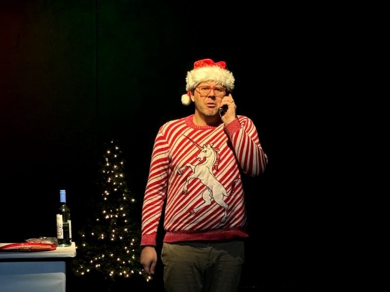 Roasting Chestnuts by Andy De brings us Drew (Eric Cline) and a disembodied Voice (Leanne Dinverno). Drew plans to hook up with a local bartender while his wife is out of town. The Voice, in Baby Reindeer style, alternately taunting and playing with him, has some, shall we say, unusual plans for him. And the bartender Neve too.