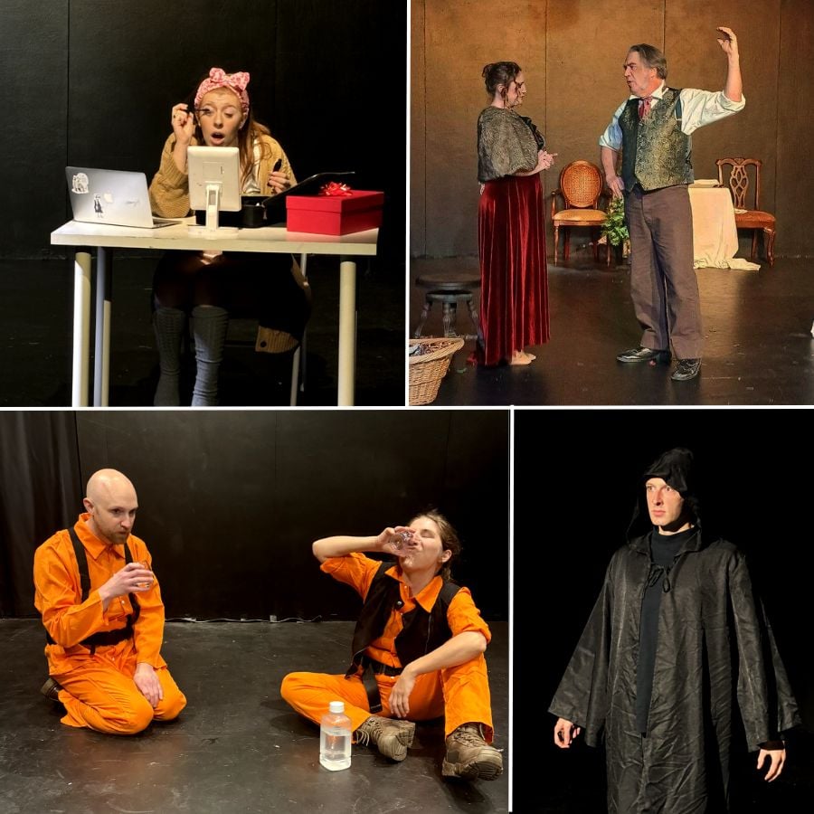 Daniel Riker as the Spirit has a series of monologues (by Andrew Quilpa) as he introduces each play. He is funny, sometimes scary, and the not-exactly-jovial host we need. He can even croon, “SLAY-bells ring, are you listening?” (Well, maybe some of the jokes are a little over the top.)