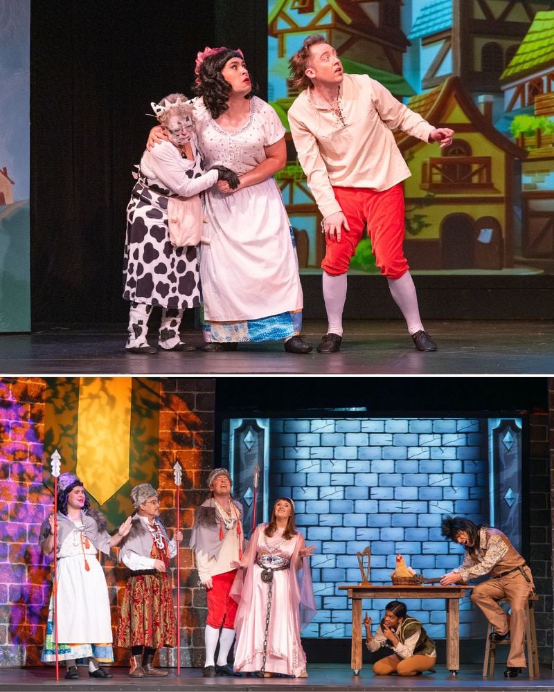 All the requisite elements of panto are here. The Principal Boy-slash-Hero, typically played by a young woman (an engagingly, thigh-slappingly gung-ho Niranjali Amerasinghe as Jack), the Dame, typically played by a man (a busty Jonathan Kilgore as Jack’s mum), the Good Fairy (Rachel Schlaff), the baddie (Ian Swank as the Giant aided by Amanda Dullin-Jones as his henchperson Slimeball), the Principal Girl (Abigail Mitchell as Princess Demelza), the requisite animal (BP life peer Pauline Griller-Mitchell as both ends of the Pantomime Cow), the King (Robert Teachout), Simple Simon (Richard Jacobson), and a raft of supporting parts. As this is a community showcase, the ensemble swells to a full two dozen performers of all ages, plus musicians.
