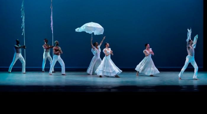 The show closed with Ailey’s famed masterwork Revelations, created in 1960, when the artist was 29 years old, and seen by more people around the globe than any other modern dance piece. Set to the music of traditional African American spirituals – which he described as “songs of trouble, love, and deliverance” – the three-part half-hour suite pays tribute to Ailey’s cultural heritage, based on personal “blood memories” from his childhood, attending Mount Olive Baptist Church in his native Rogers, Texas, hearing the gospel songs, and envisioning them. Those include such rousing numbers as “I Been ’Buked,” “Wade in the Water, and “Rocka My Soul in the Bosom of Abraham,” brought to life by a fervent cast of nine women and nine men, and staged with mood-setting lighting (by Nicola Cernovitch) and aptly-colored period-style costumes and props (designed by Ves Harper), such as the iconic white parasol to block the baking sun of the South, seen behind the dancers on the large projection screen.