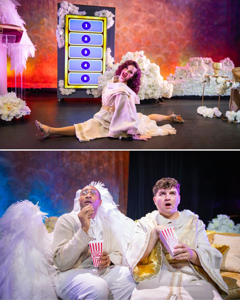 When God and the angels take the stage in character, James V. Raymond’s set shifts from the rehearsal hall to a more celestial look, with a diaphanous, iridescent, pastel-toned backdrop and flown-in puffy clouds of flowers. Gabriel’s darker lectern and God’s gold and rose-tinted sofa were nice variations from the white-dominated, talk show-style sets I’ve seen in video clips of other productions. The sound (Zach Sexton) and lighting (Thomas P. Gardner) designs were as tongue-in-cheek bombastic as one could ask for in a show featuring an overlord as temperamental and capricious as any denizen of Olympus.