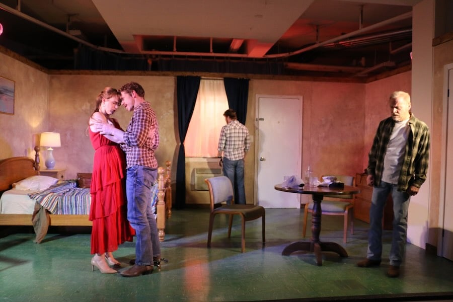 Kevin Dykstra is The Old Man, who sits in the far downstage corner most of the time, watching the intimate moments, heightened drama, and unfortunate love-triangle development of Eddie and May. His identity is ambiguous at first, and he is clearly on a plane apart from reality, but as he interacts with the pair, arguing about differing accounts of the stories being told and offering his own reminiscence in context, the dynamic of their connection becomes clear. And the reliability of his input is muddied. Dykstra’s Old Man is oblivious to the wreckage of his own life and serves as, if not a justification for the horrid situation, at least a pitied understanding of how things came to be.