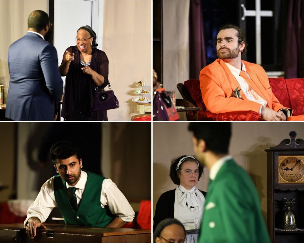 As Charles Granillo, Joseph Battley II is excitable to the point of hysteria, and by turns petulant, sulky, and brash. His comic timing is very good. Vedant Sharma, playing chief anti-hero Wyndham Brandon, a classmate of Charles, Kenneth, and one other character whom we never see, is elegant and smooth, with a snappy delivery that doesn’t strain our ability to hear and comprehend the content of his lines. As house servant Sabot, Polly O’Rourke has a dour dryness that makes her quite convincing in the role. Playing Kenneth Raglan, Carter Wescott is every inch the fresh-faced, eager-to-please puppy of a young man, quite susceptible to the charms of Leila Arden, played with an air of blithe empty-headedness that takes quite a lot of skill by Rebecca Goldberg. Edward V. Crews plays book collector Johnstone Kentley with stuffy scholastic ways, and as his sister Mrs. Debenham, Elizabeth L. E. Wiggins is comedy genius in motion and dialogue. Edward Brennan in the investigative role of Rupert Cadell is the highlight of the show with sardonic wit, dry delivery, and impeccable timing.